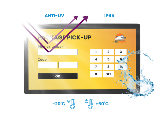 Le moniteur offre une protection complète contre les différentes conditions ambiantes. Grâce à la résistance aux UV et à la protection IP65, il est protégé contre la lumière du soleil et résiste à la poussière et à l'eau par l'avant. En outre, il peut fonctionner de manière fiable à des températures allant de -20˚C à 60˚C, ce qui lui permet de résister à d'importantes variations de température.