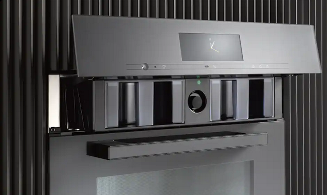 Design et confort d’utilisation combinés : Le bandeau de commande s’ouvre et se ferme délicatement d’une simple pression du doigt, sans ouvrir la porte de l’appareil. Derrière le bandeau de commande relevable se trouvent le réservoir d’eau, le réservoir d’eau de condensation et la thermosonde sans fil. Le bandeau de commande s’incline vers vous lorsque vous appuyez sur la touche sensitive afin de vous offrir la meilleure vue possible sur l’écran.