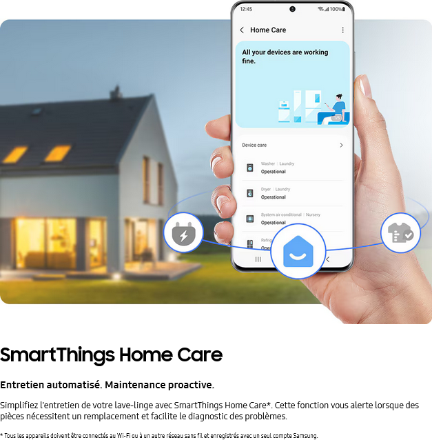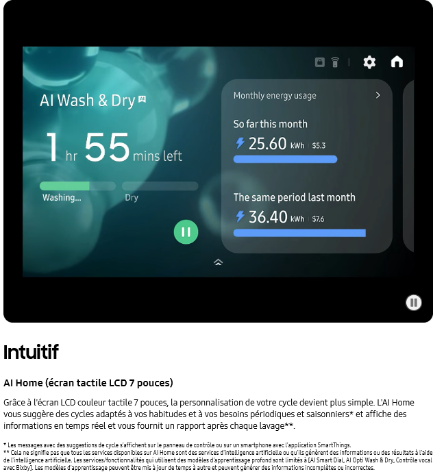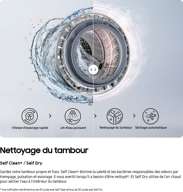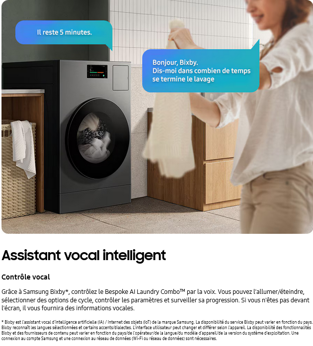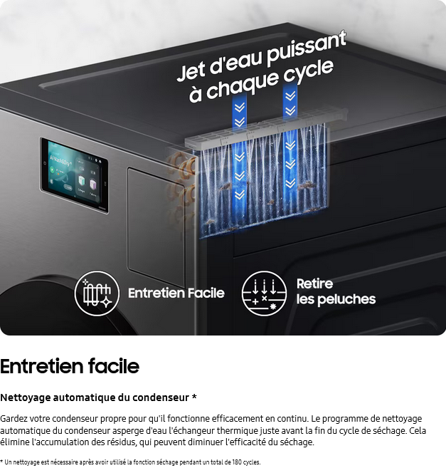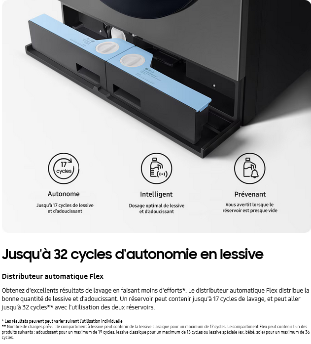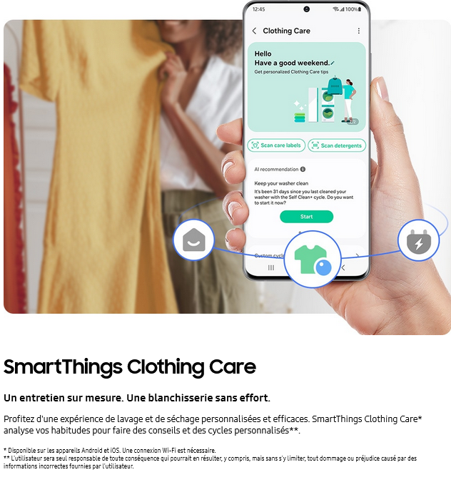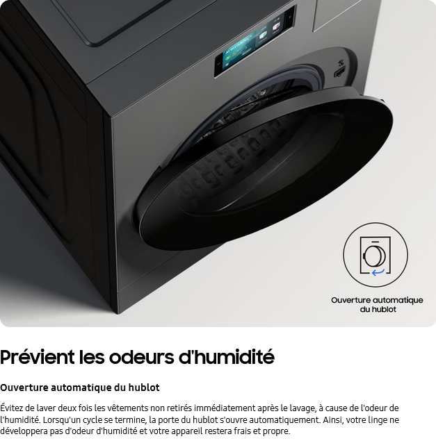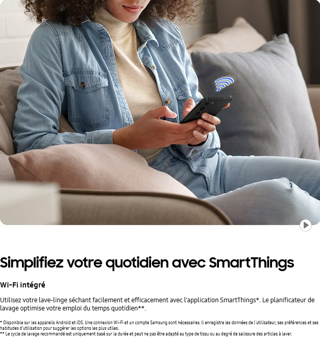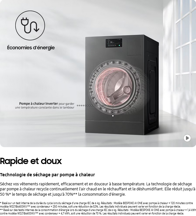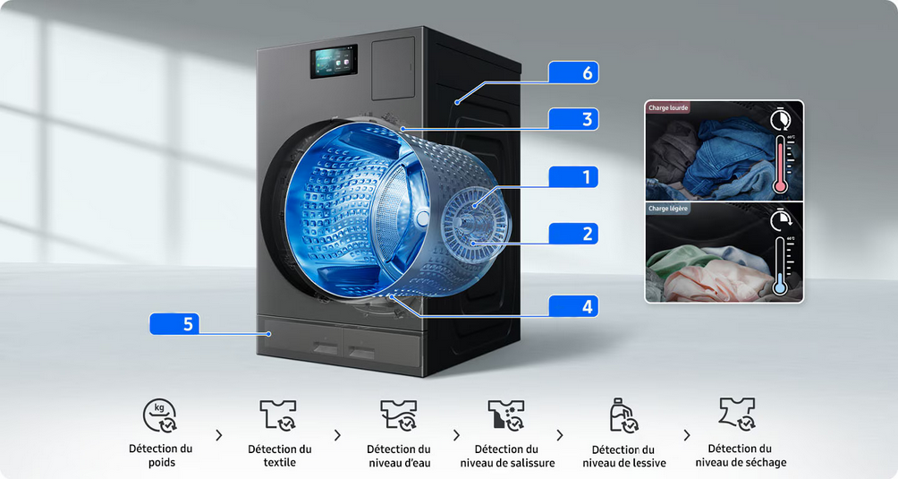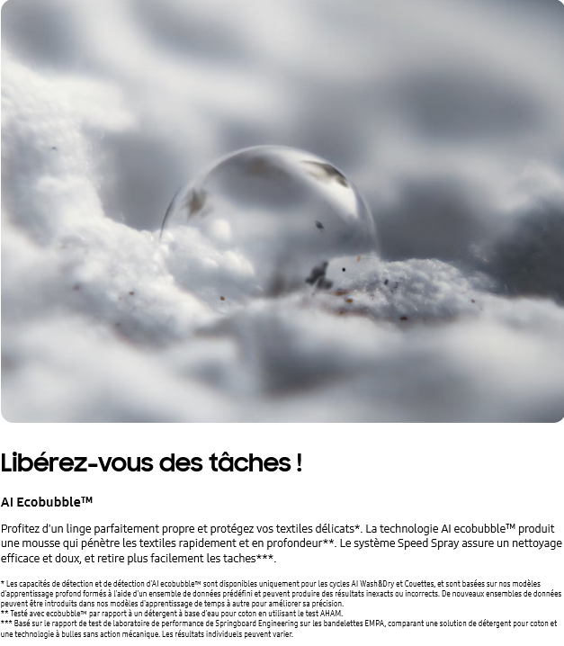 Lavez et séchez vos vêtements de manière minutieuse et efficace*. AI Wash & Dry détecte le poids du linge et utilise la bonne quantité d'eau et de lessive. Il détecte également le type de textile** et surveille le niveau de salissure. Il ajuste ensuite le processus de séchage selon le poids et le type de textile.