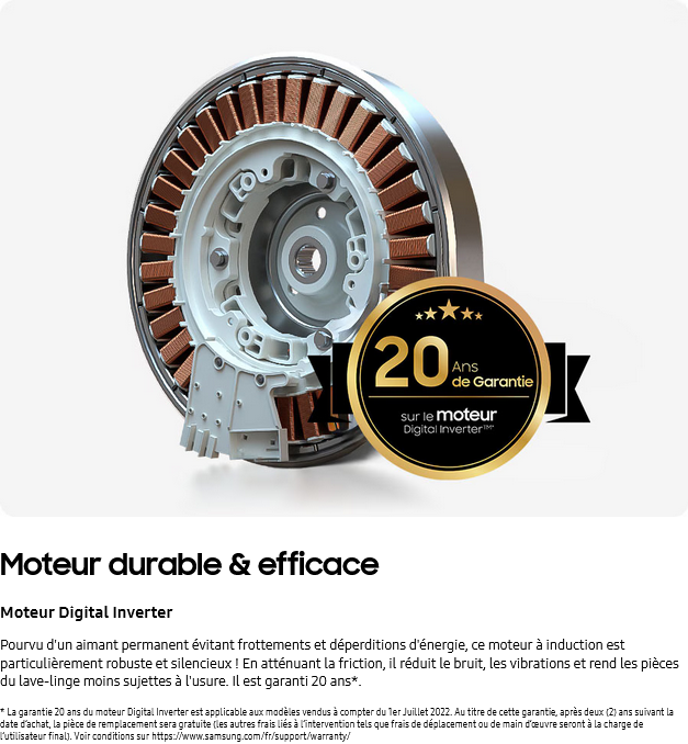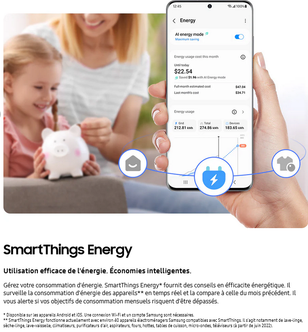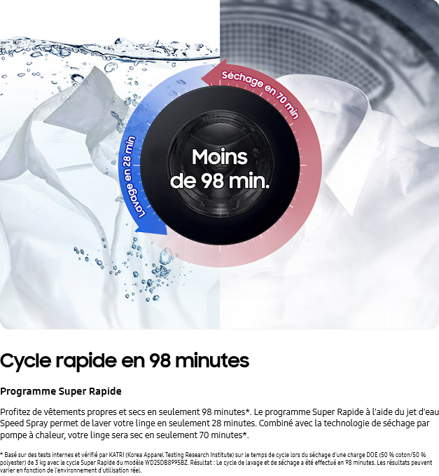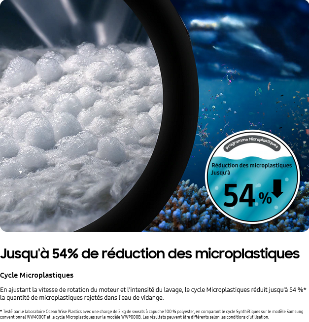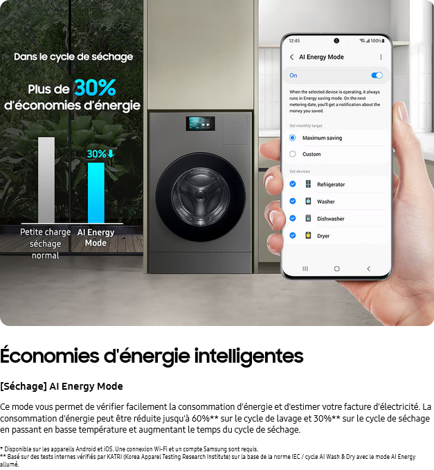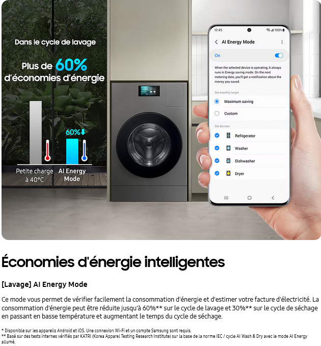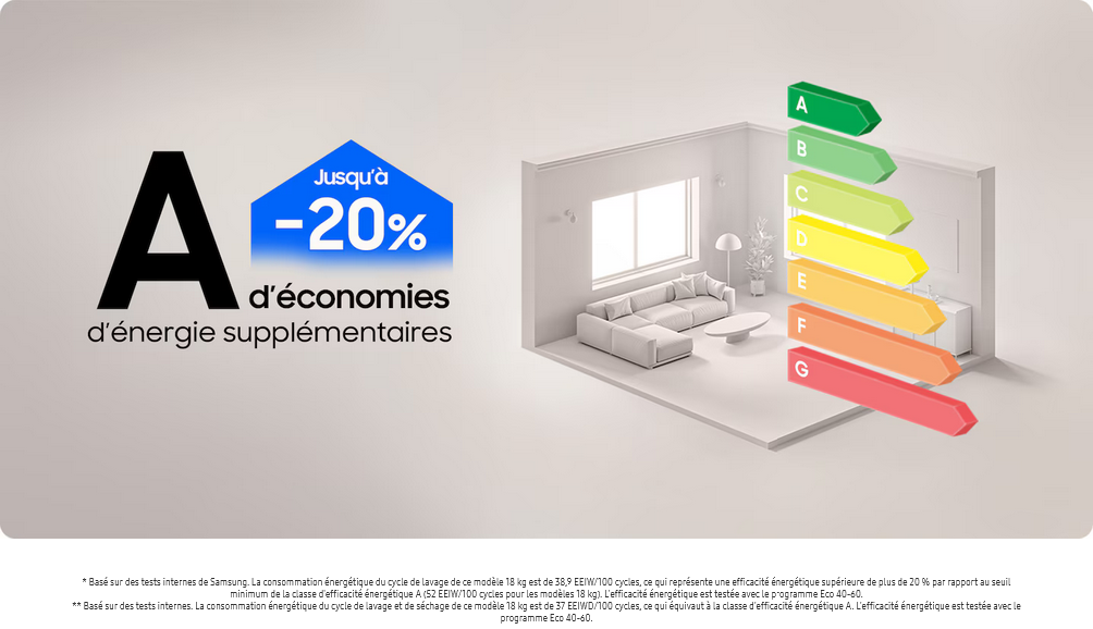 Lavez vos vêtements en consommant moins d'énergie. Le lave-linge séchant Samsung est très économe en énergie et dépasse même de 20 %* les exigences minimales en matière d'efficacité énergétique donnée à la classe A**. Des technologies avancées et intelligentes améliorent les performances et réduisent le temps de lavage, ce qui diminue la consommation d'énergie.