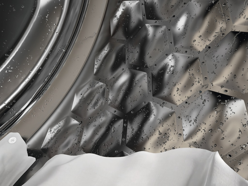 Le design unique de notre tambour Hydrogliss est important pour préserver votre linge. Grâce à sa structure spéciale, une couche d’eau se forme entre le tambour et les textiles lors de la rotation. Votre linge peut ainsi glisser en toute sécurité et les fibres restent protégées. Résultat : Votre linge conserve sa qualité pour longtemps.![]()