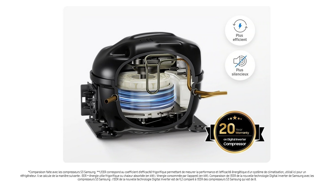 La nouvelle génération du Digital Inverter possède une nouvelle structure améliorée, avec une inertie 4,1 fois supérieure à la génération précedente*. Son fonctionnement est donc plus efficient**. La garantie 20 ans du compresseur Digital Inverter est applicable aux modèles vendus à compter du 1er Juillet 2022. Au titre de cette garantie, après deux (2) ans suivant la date d’achat, la pièce de remplacement sera gratuite (les autres frais liés à l’intervention tels que frais de déplacement ou de main d’œuvre seront à la charge de l’utilisateur final). Voir conditions sur https://www.samsung.com/fr/support/warranty/