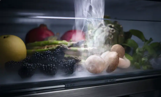 Le système de réfrigération PerfectFresh Active de Miele garantit des conditions de stockage optimales dans votre réfrigérateur. Toutes les 90 minutes et à chaque ouverture de porte, un brouillard d’eau fin est pulvérisé dans le tiroir. Vos aliments sont légèrement humidifiés et le niveau d’humidité de l’air est toujours optimal, quelle que soit la charge. Il vous suffit de remplir le réservoir d’eau, votre appareil Miele se charge du reste.