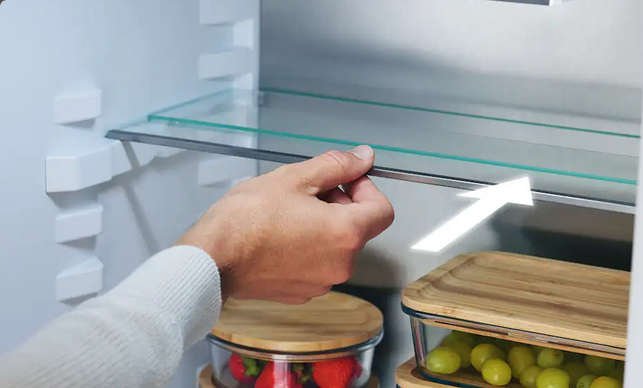 Souvent, seule la porte du réfrigérateur peut accueillir des récipients hauts. La tablette en verre FlexiBoard Miele permet de placer ces derniers dans la partie réfrigération. Il suffit de faire glisser la partie avant du FlexiBoard sous la partie arrière. L’espace créé permet d’accueillir des bouteilles ou des briques de lait. La partie arrière peut toujours servir de surface de stockage. Vous utilisez ainsi au mieux l’espace disponible.